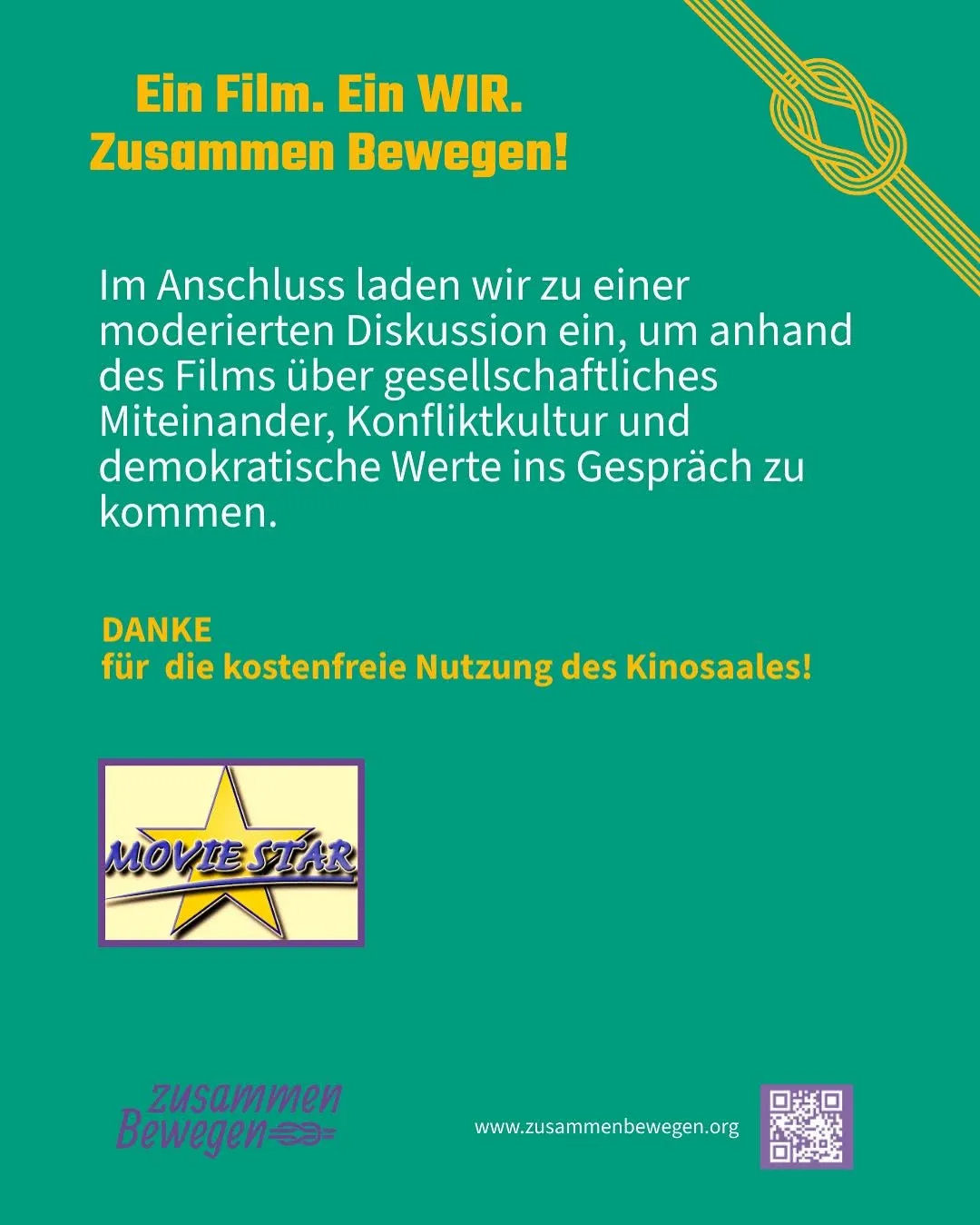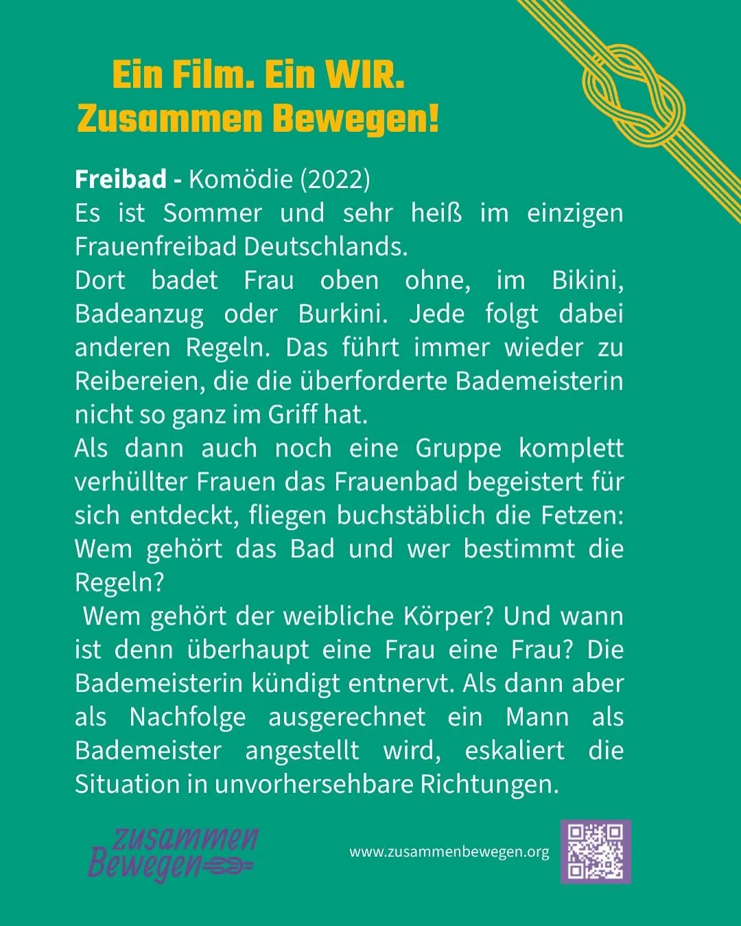 Wir zeigen: Freibad (Komödie), einen Film, der Mut macht und zum Nachdenken anregt – über Demokratie, Zusammenhalt und die Werte, die unsere Gesellschaft tragen. Im Anschluss möchten wir mit euch ins Gespräch kommen.