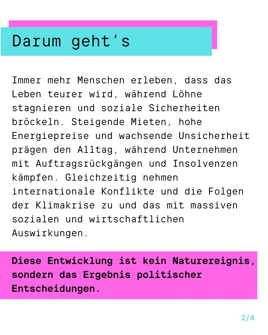 Immer mehr Menschen erleben, dass das Leben teurer wird, während Löhne stagnieren und soziale Sicherheiten bröckeln. Steigende Mieten, hohe Energiepreise und wachsende Unsicherheit prägen den Alltag, während Unternehmen mit Auftragsrückgängen und Insolvenzen kämpfen. Gleichzeitig nehmen internationale Konflikte und die Folgen der Klimakrise zu und das mit massiven sozialen und wirtschaftlichen Auswirkungen. Diese Entwicklung ist kein Naturereignis, sondern das Ergebnis politischer Entscheidungen.