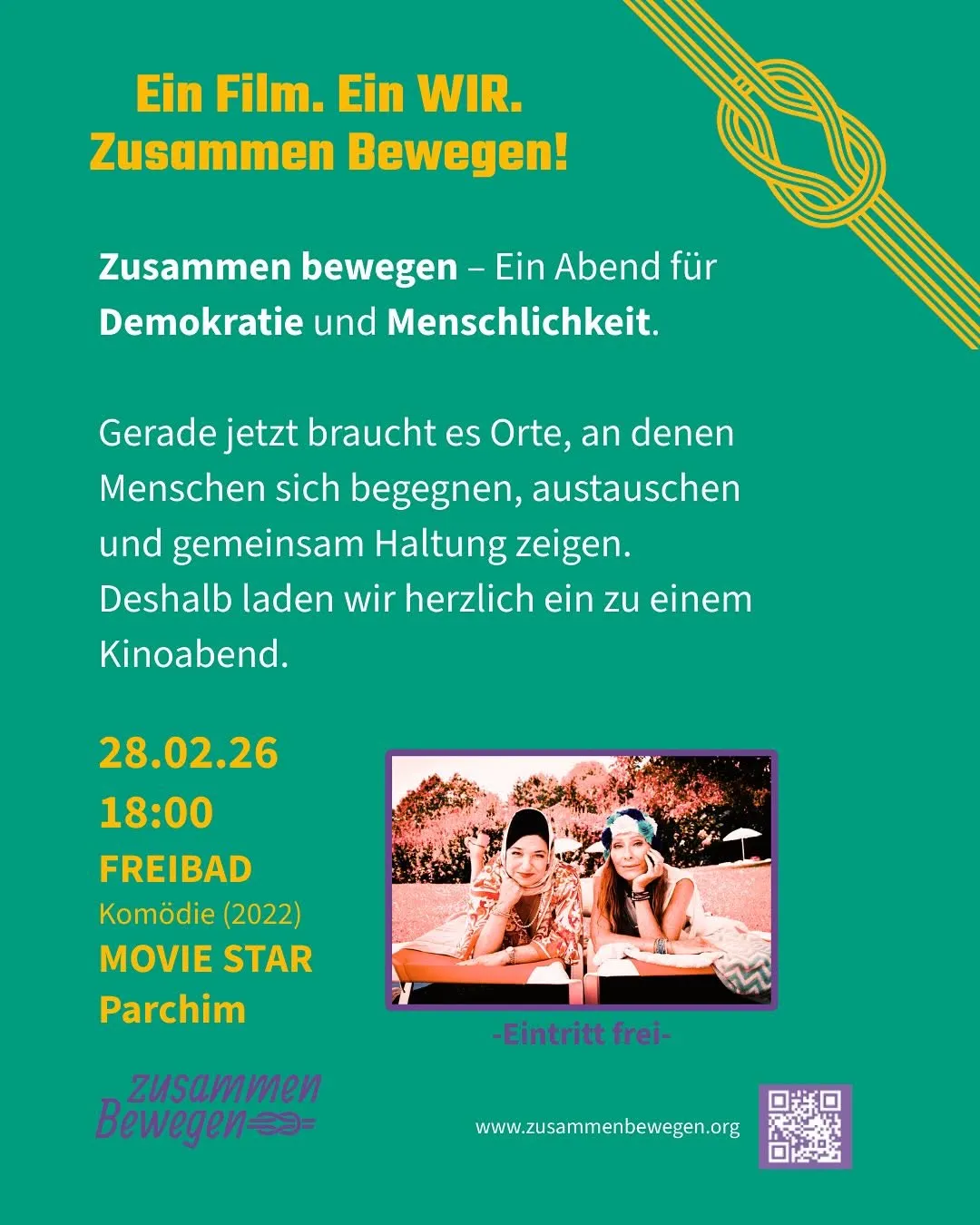 Ein Abend für Demokratie und Menschlichkeit - gerade jetzt braucht es Orte, an denen Menschen sich begegnen, austauschen und gemeinsam Haltung zeigen. Deshalb laden wir herzlich ein zu einem Kinoabend in das Moviestar Parchim.