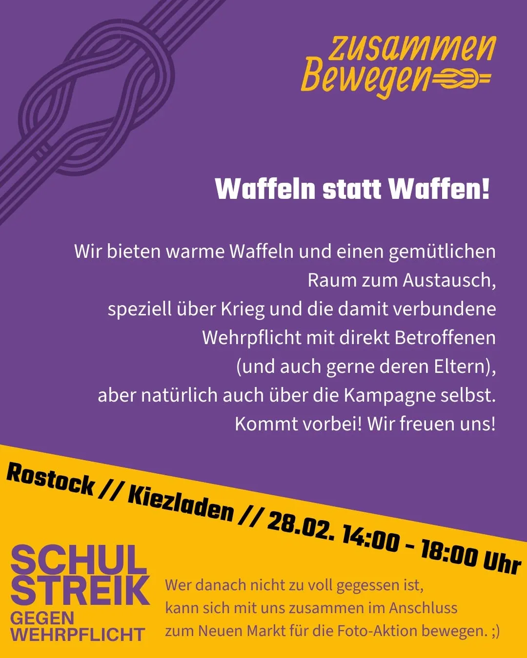 Bei uns gibt es warme Waffeln gegen Spende in einem gemütlichen Raum zum Austausch - speziell über Krieg, die damit verbundene Wehrpflicht und wieso wir dagegen streiken.